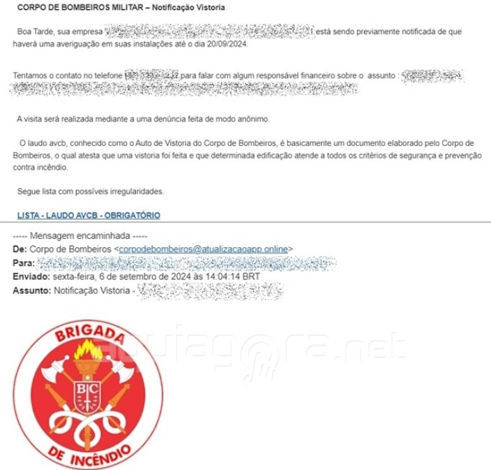Esse tal e-mail foi enviado para algumas empresas com informações sobre “vistoria do Corpo de Bombeiros nas instalações” e citando que a vistoria seria feita após “denúncias anônimas”.