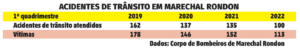 Consequentemente, o número de vítimas de acidentes de trânsito atendidas pelos bombeiros em Marechal Rondon também diminuiu, passando de 178 em 2019 para 113 no 1º quadrimestre de 2022: uma redução de 36%. “A maior parte, 69%, são acidentes com vítimas com ferimentos leves, o que indica que a maior parte dos acidentes acontece por falta de atenção, descuido e distrações”, indica.