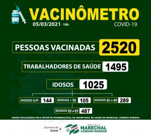 Do total de imunizados contra o coronavírus no município rondonense, 1.495 pessoas fazem parte do grupo de trabalhadores da saúde e 1.025 são idosos. Entre o grupo de idosos, 144 são de Instituições de Longa Permanência de Idosos (ILPI), 105 são do grupo de maiores de 90 anos, 289 são da faixa etária entre 85 e 89 anos e 487 são da faixa entre 80 e 84 anos.