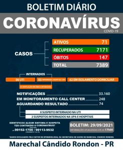 As informações indicam que 13 pessoas venceram o coronavírus nas últimas 24 horas em Marechal Rondon. Ao todo, há 7.171 recuperados da Covid-19 no município e 147 pessoas morreram por complicações da doença.
