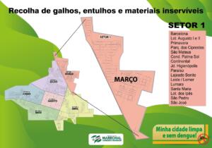 A Secretaria de Agricultura, Pecuária e Desenvolvimento Sustentável iniciou, neste mês, o cronograma de recolha de galhos, entulhos e materiais inservíveis na sede de Marechal Cândido Rondon. Conforme os anos anteriores, a cidade foi dividida em seis setores. Em cada setor os serviços de recolha serão realizados durante um mês.