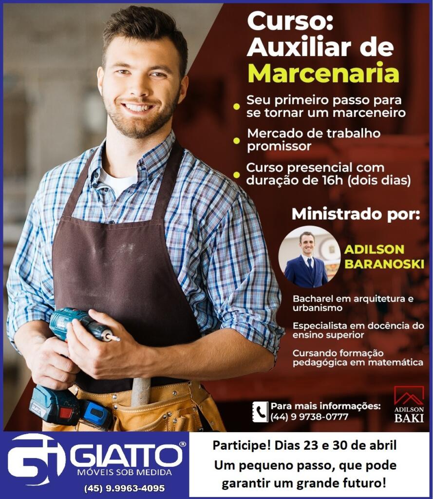 O curso é aberto para o público em geral e será realizado na Marcenaria Giatto Móveis, na Avenida Rio Grande do Sul, 7580. O investimento é de R$ 70 e as inscrições podem ser realizadas pelo telefone (44) 99738-0777.
