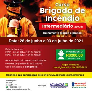 Os interessados em participar do curso de Brigada de Incêndio promovido pela Associação Comercial e Empresarial de Marechal Cândido Rondon (Acimacar) ainda podem se inscrever na capacitação, que acontece nos próximos dois sábados: 26 de junho e 03 de julho, das 8 horas às 12 horas e das 13 horas às 18 horas.