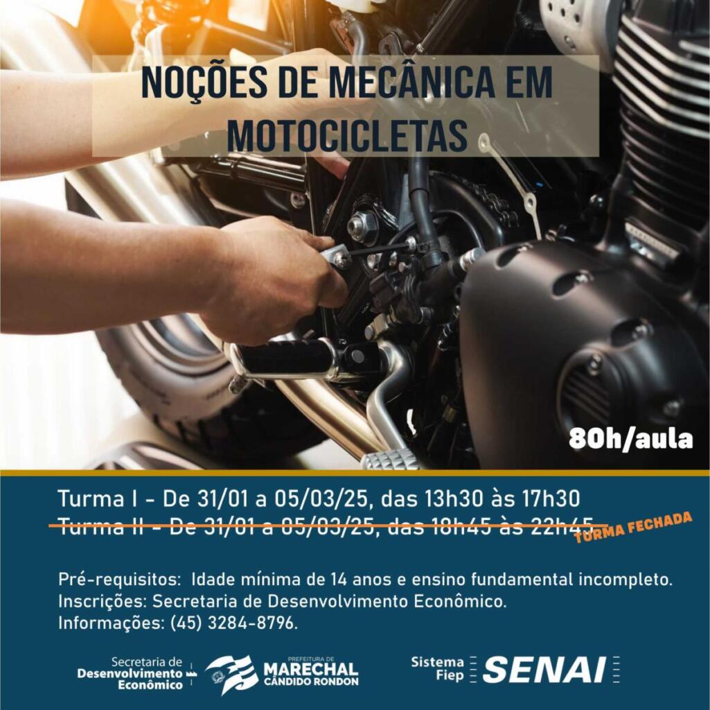 A Secretaria de Desenvolvimento Econômico da prefeitura de Marechal Cândido Rondon promove curso de noções de mecânica em motocicletas, que terá 80 horas/aula. Serão duas turmas de 16 alunos, cada. As aulas acontecerão de 31 de janeiro a 5 de março, sendo uma das turmas das 13h30 às 17h30 e a outra das 18h45 às 22h45. Para o período noturno, a turma já está fechada. Restam ainda algumas vagas para o período da tarde.