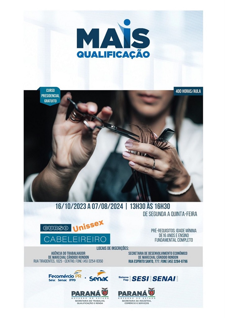 O programa Mais Qualificação, desenvolvido pelo governo do Estado, por meio da Secretaria do Trabalho, Qualificação e Renda, está oferecendo mais uma capacitação em Marechal Cândido Rondon. Trata-se do curso de cabeleireiro unissex, que acontecerá de 16 de outubro de 2023 a 7 de agosto de 2024, totalizando 400 horas/aulas.