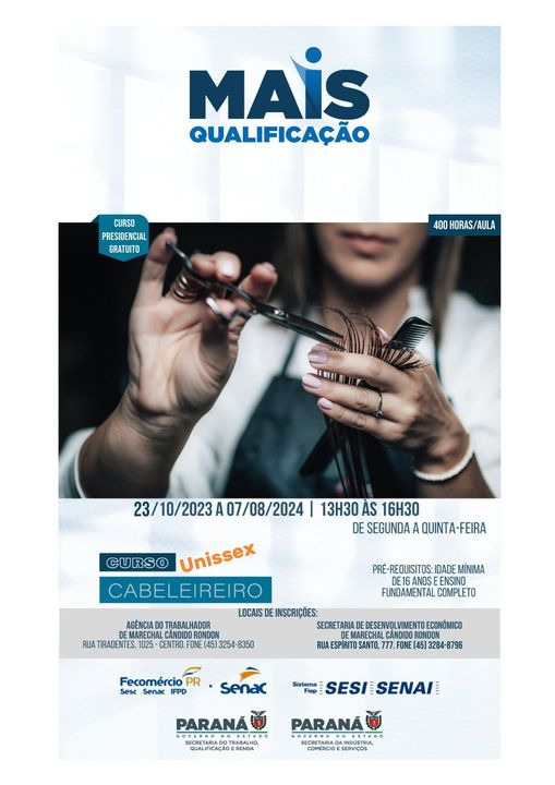 Ainda restam vagas para o curso unissex de cabeleireiro que acontecerá em Marechal Cândido Rondon, de 23 de outubro de 2023 a 07 de agosto de 2024, totalizando 400 horas/aulas. A capacitação será realizada de segunda a quinta-feira, das 13h30 às 16h30, e visa repassar técnicas para que os alunos aprendam a analisar e a conceituar o formato do rosto e tipos de cabelo e para que dominem técnicas de higiene, atendimento ao cliente e ética profissional, além de procedimentos realizados em um salão de beleza, como corte, escova, coloração, penteados, entre outros.