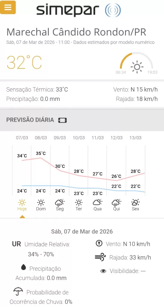 Confira a previsão do tempo para Marechal Rondon, segundo o Simepar:
