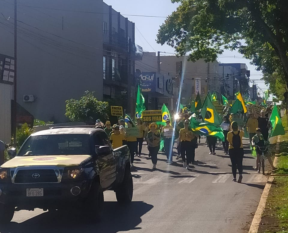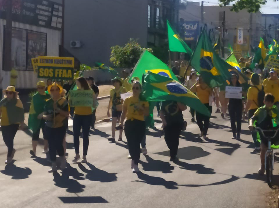 A concentração aconteceu na Rotatória da Bandeira, no encontro das avenidas, e por volta das 16 horas os manifestantes, trajados, em sua maioria, de verde e amarelo, foram caminhando em direção ao portal da cidade, local onde estão ocorrendo as manifestações desde 1° de novembro, após o resultado do 2º turno das eleições.