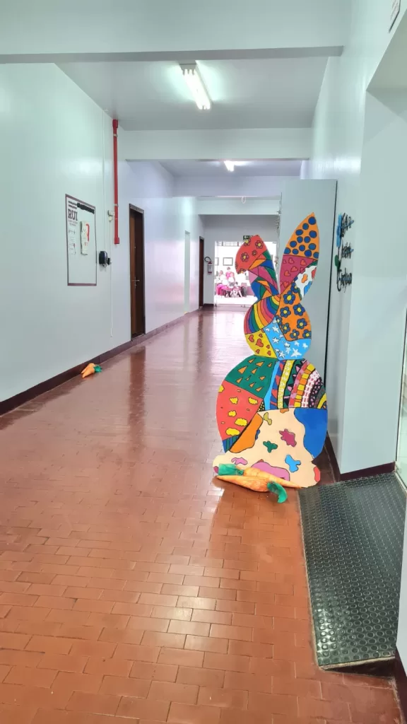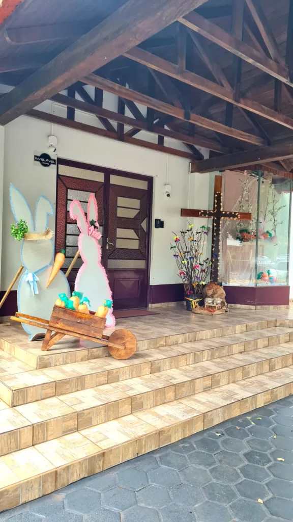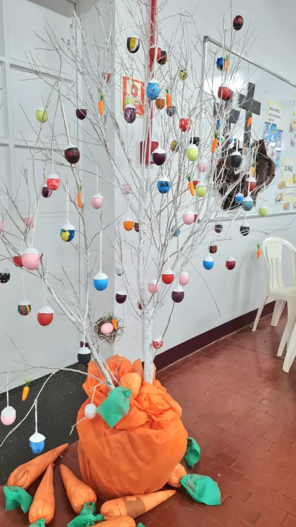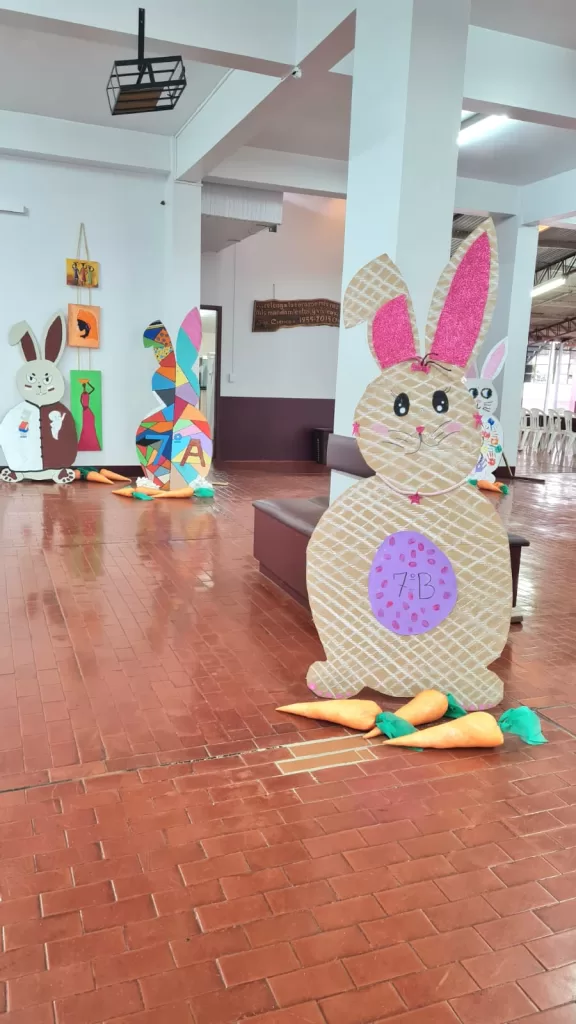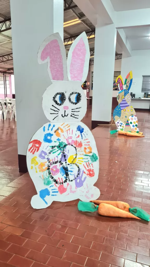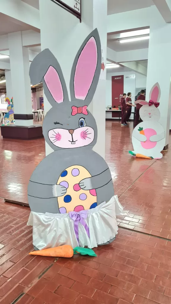 A decoração de Páscoa foi desenvolvida pelos alunos de diferentes séries, do 9º ano à 3ª série do Ensino Médio, durante as aulas de Arte, coordenadas pela professora Eloíse Brand, com a participação e colaboração das turmas do 4º e 5º anos, evidenciando o espírito colaborativo de todos os envolvidos. O projeto envolveu a confecção de coelhos de papelão e a reutilização de materiais recicláveis, confecção de árvore de Páscoa, conhecida como Osterbaum, e mural ilustrativo com demonstração do significado dos símbolos da Páscoa, como uma maneira criativa de promover a conscientização ambiental e a valorização dos recursos disponíveis, um trabalho coletivo desenvolvido e muito apreciado por todos.
