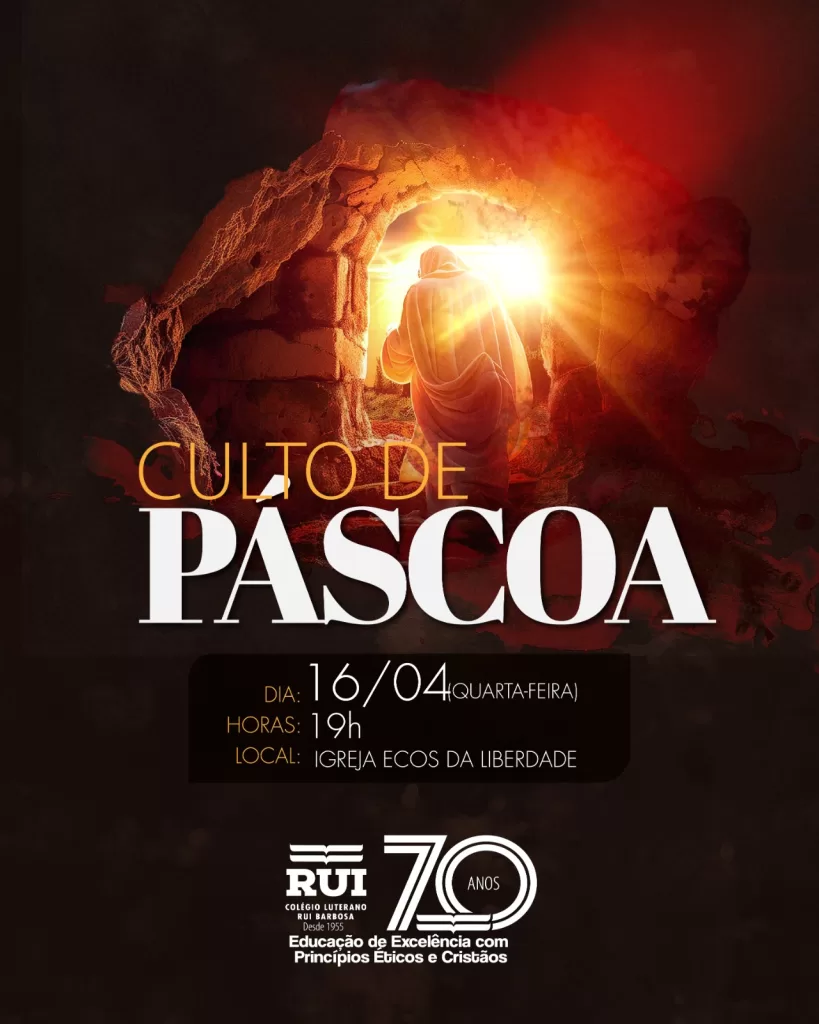 O Colégio Luterano Rui Barbosa destaca ainda o Culto de Páscoa, momento onde a comunidade escolar estará reunida na Igreja Ecos da Liberdade, para apresentações de corais, reflexão e comunhão com a vida e ressurreição de Cristo. O evento inicia as 19 horas, nesta quarta-feira (16).