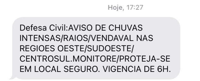 Conforme o órgão, há possibilidade de chuvas intensas, raios e vendaval na região Oeste, Sudoeste e Centrosul. Com vigência de seis horas, o alerta tem validade até as 23h47.
