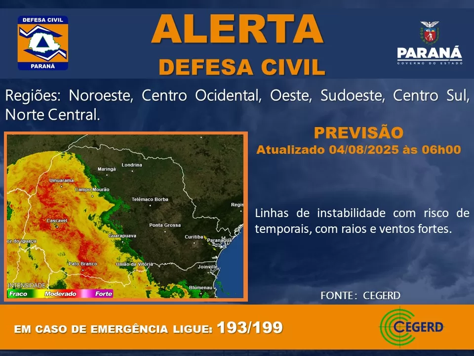 A Defesa Civil emitiu um aviso de chuvas com risco de temporais, raios e ventos fortes para diversas regiões do Paraná nesta segunda-feira (4).