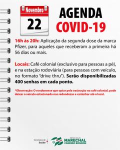 Conforme o cronograma, será aplicada segunda dose de vacina da marca Pfizer para aqueles que receberam a primeira dose a 56 ou mais.