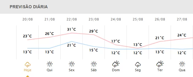 À tarde, as temperaturas máximas deverão se aproximar dos 20°C em todo o estado, com valores superiores aos 25°C em municípios próximos à divisa com o estado de São Paulo e também da faixa litorânea.