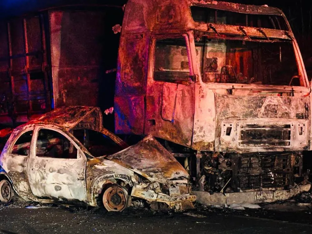 O KA ficou preso no veículo pesado, foi arrastado por 211 metros, segundo medição oficial da PRF, que atendeu o acidente e depois os dois incendiaram.