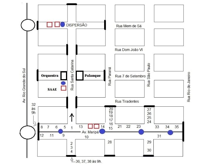 O desfile começa na Rua Santa Catarina, com início na esquina da Avenida Maripá e término na rua Mem de Sá. Confira o mapa do trajeto:
