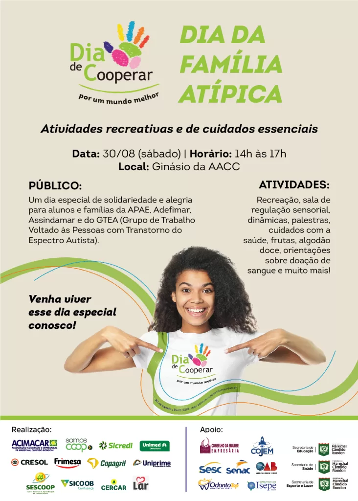 O Conselho das Cooperativas da Acimacar promove no próximo sábado, 30 de agosto, o evento Dia da Família Atípica, dentro da programação do Dia C – Dia de Cooperar. A iniciativa acontece no Ginásio da AACC, das 14 horas às 17 horas, e contará com diversas atividades gratuitas voltadas para alunos e famílias da APAE, Adefimar, Assindamar e do Grupo de Trabalho Voltado às Pessoas com Transtorno do Espectro Autista (GTEA), sendo aberto a toda a comunidade.