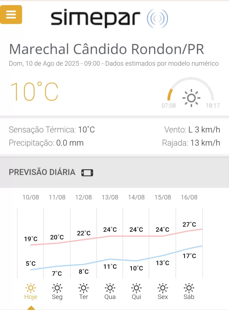 Veja a previsão do tempo para Marechal Rondon nos próximos dias, segundo o Simepar: