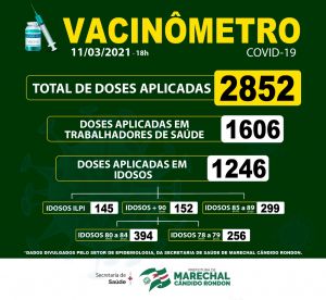 Os casos ativos de Covid-19, por sua vez, diminuíram: ontem (10) eram 328 – número recorde em Marechal Rondon – e hoje são 321. Desse total, 299 pessoas estão em isolamento domiciliar, seis estão internados na Unidade de Pronto Atendimento (UPA) ou em hospitais e 16 encontram-se em Unidade de Terapia Intensiva (UTI).