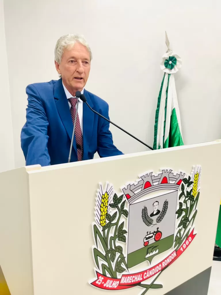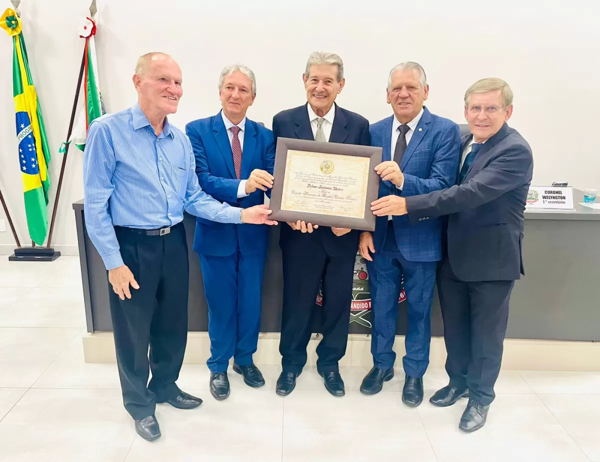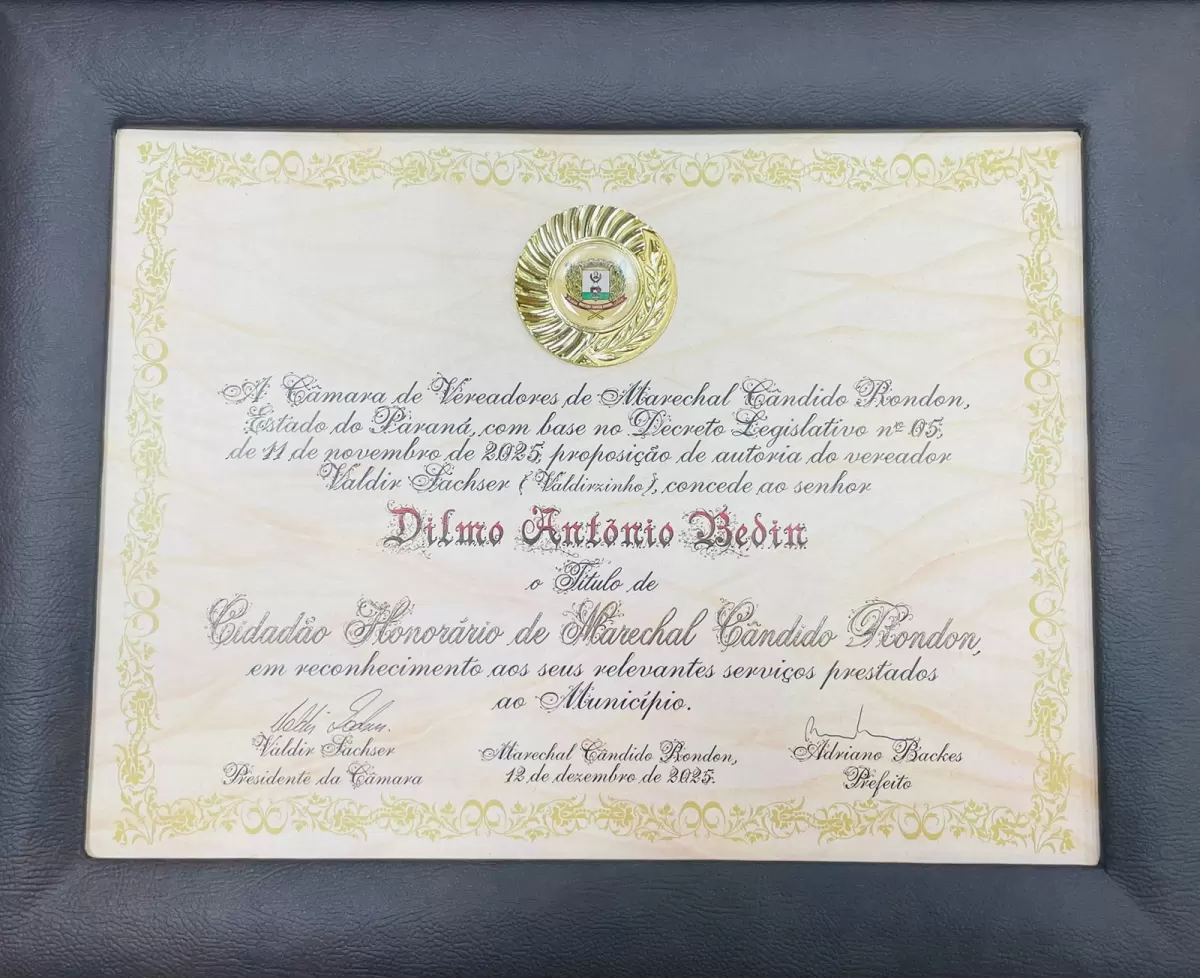 Na noite de sexta-feira (20), o Poder Legislativo de Marechal Cândido Rondon realizou sessão solene para a entrega do título de “Cidadão Honorário do Município” ao professor e ex-vereador Dilmo Antônio Bedin. A cerimônia aconteceu no plenário da Câmara de Vereadores.