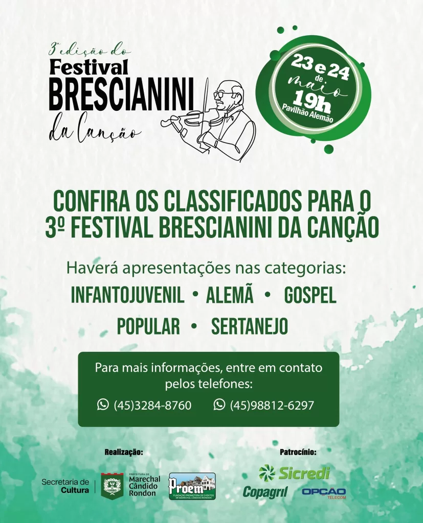 O Festival Brescianini da Canção contará com três categorias: alemã, com três candidatos a partir de 10 anos; infantojuvenil livre, destinada a participantes de 10 a 15 anos completos até a data do evento, com 15 inscritos; e adulto, para candidatos a partir de 16 anos, dividida nos estilos gospel, com 15 participantes; popular, também com 15; e sertanejo, que terá 10 concorrentes. A lista completa dos classificados pode ser consultada em neste link.