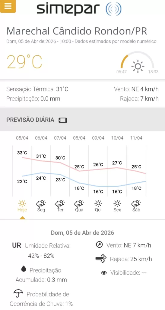 Confira a previsão do Simepar para Marechal Rondon: