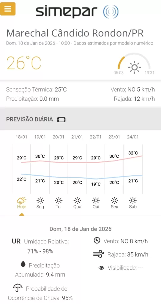 - Segunda-feira (19/01): O sol volta a predominar, com máxima de 31°C e mínima de 20°C. A probabilidade de chuva é baixa, apenas 4%, favorecendo atividades ao ar livre.