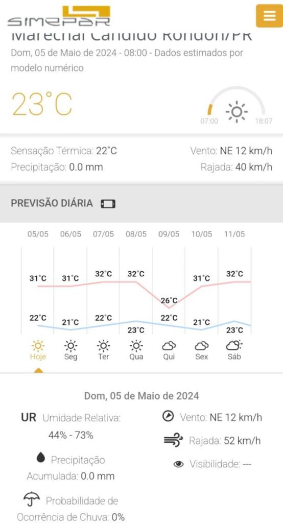 O domingo (05) amanheceu com tempo estável em Marechal Cândido Rondon. Logo cedo a temperatura estava na casa dos 22°C. A máxima prevista para hoje é de 31°C com predomínio de sol.