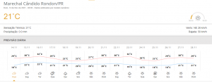 O Simepar indica possibilidade de 21,1 milímetros de chuva para a semana em Marechal Rondon, sendo 2,6 milímetros na quarta-feira (17) e 18,5 milímetros na quinta-feira (18). Confira a previsão para os próximos dias: