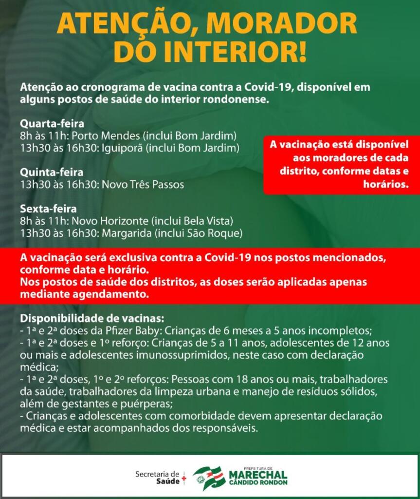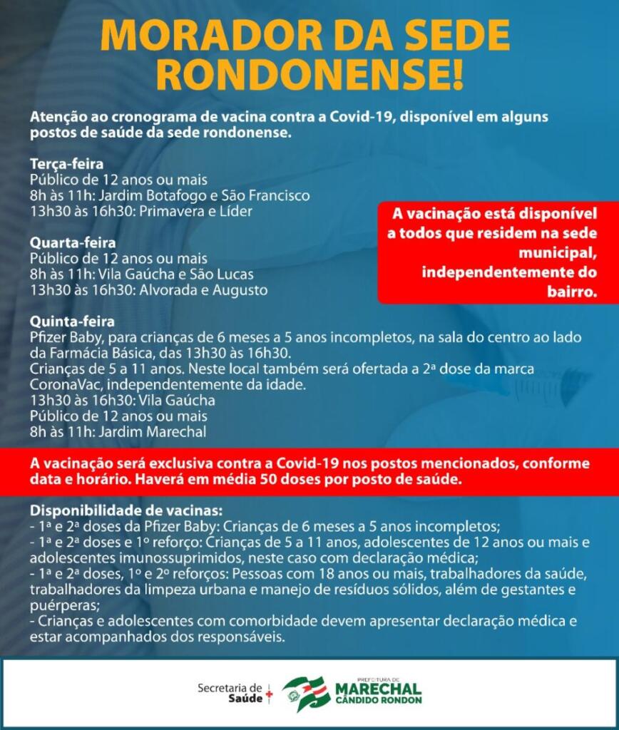 Na sede de Marechal Rondon, as vacinas são oferecidas às pessoas com idade a partir dos 12 anos nas terças-feiras, tendo por locais os postos de saúde do Botafogo e do São Francisco, das 8 horas às 11 horas. No Primavera e Líder, os imunizantes são disponibilizados das 13h30 às 16h30.