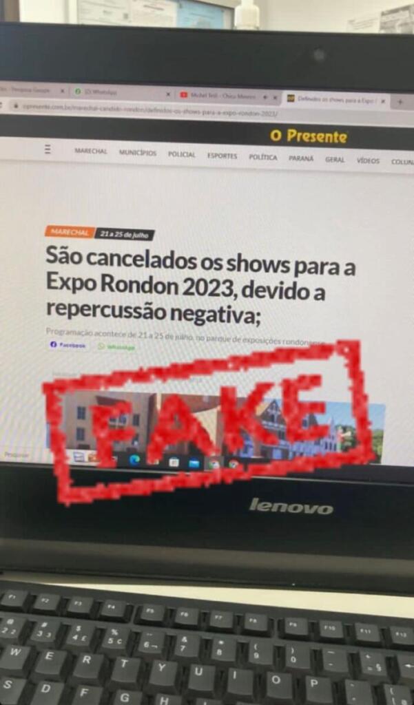 Circula nas redes sociais uma imagem de que o Jornal O Presente teria noticiado o cancelamento dos shows da Expo Rondon 2023. O título original da notícia publicada na manhã desta terça-feira (21) é “Definidos os shows para a Expo Rondon 2023”. Já o título que consta na imagem, como uma suposta notícia, é: “São cancelados os shows para a Expo Rondon 2023, devido a repercussão negativa;”. Tanto a imagem que usa o site de O Presente divulgando a informação quanto a informação são FALSAS.