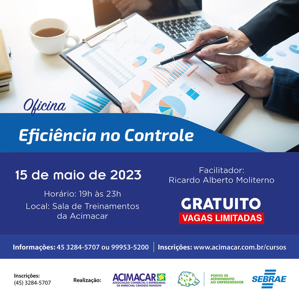 Para empresários que estão buscando novas maneiras de aumentar a sua produtividade e os seus resultados de forma ágil, diminuindo seus custos e eliminando ações e processos desnecessários, a Associação Comercial e Empresarial de Marechal Cândido Rondon (Acimacar) promove a oficina gratuita “Eficiência no Controle”.