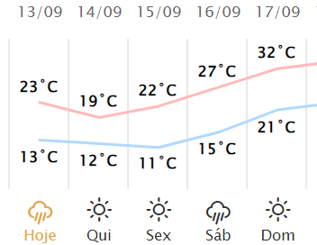 Para quinta-feira (14) a mínima prevista é de 8ºC e a máxima de 19ºC.