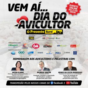 Assim, para homenagear de uma forma direta, nesta sexta-feira, dia 27 de agosto, acontece o 1º Dia do Avicultor O Presente Rural. O evento acontecerá de forma presencial, com número restrito de convidados, respeitando as normas sanitárias do Ministério da Saúde, e será transmitindo ao vivo pelo Facebook e canal do YouTube.