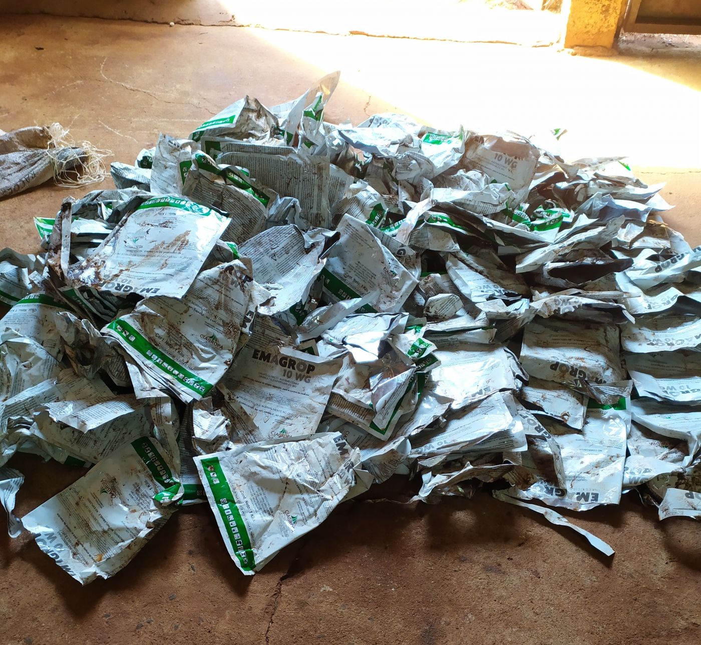 Embalagens vazias de agrotóxico de origem estrangeira estavam acondicionadas dentro de saco que foi retirado de um rio (Foto: Divulgação/Adapar)