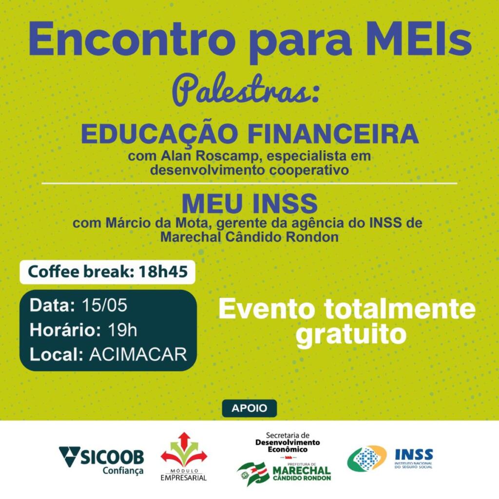 A prefeitura de Marechal Cândido Rondon, através da Secretaria de Desenvolvimento Econômico e do Módulo Empresarial, organiza o Encontro para MEIs. O evento totalmente gratuito será realizado segunda-feira (15), com início às 19 horas, na Associação Comercial e Empresarial de Marechal Rondon (Acimacar).