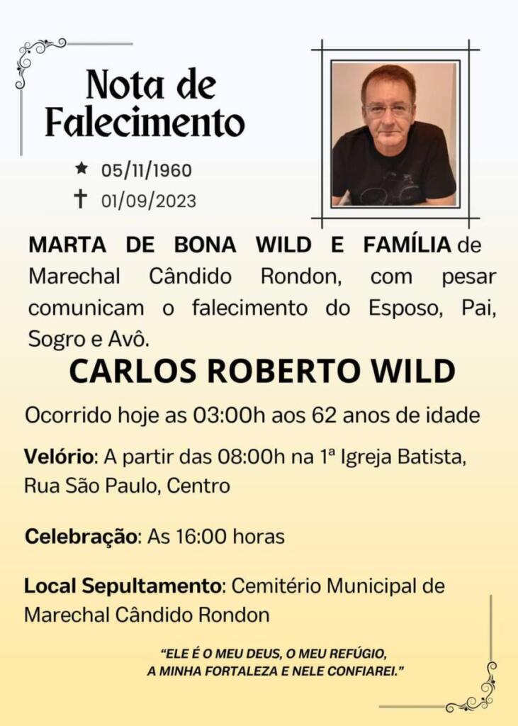Faleceu na madrugada desta sexta-feira (1º), por volta das 03 horas, vítima de infarto fulminante, o engenheiro civil Carlos Roberto Wild, de Marechal Cândido Rondon.