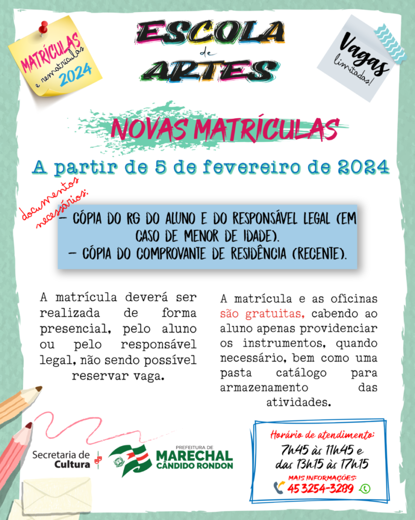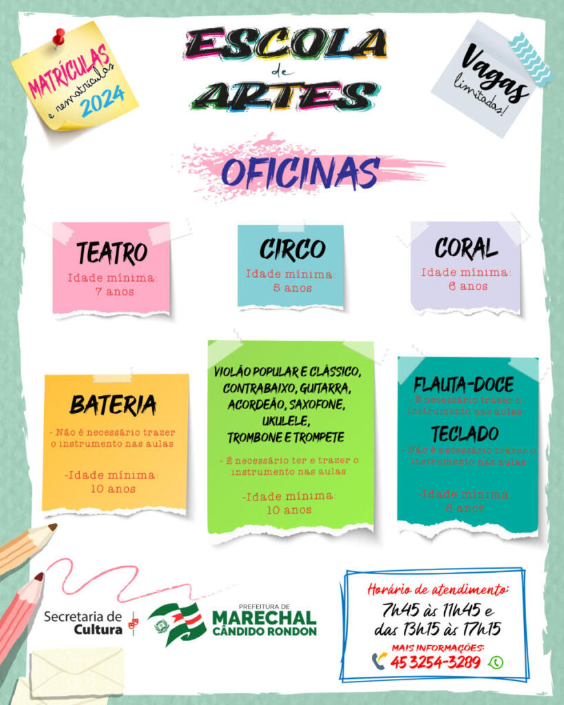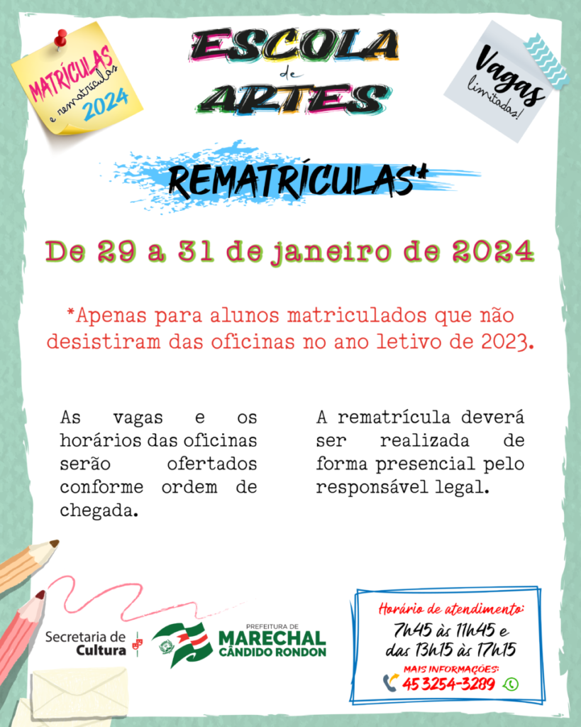A Secretaria de Cultura de Marechal Cândido Rondon abrirá de 29 a 31 de janeiro, o período de rematrículas das atividades realizadas na Escola de Artes para alunos não desistentes.