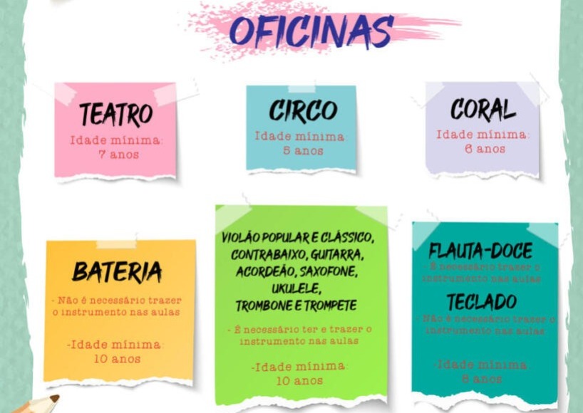 São ofertadas atividades de musicalização, através de acordeão (gaita), contrabaixo, guitarra, saxofone, trombone, trompete, ukulele, além de violão clássico e popular; bateria, flauta-doce e teclado; coral, circo e teatro.