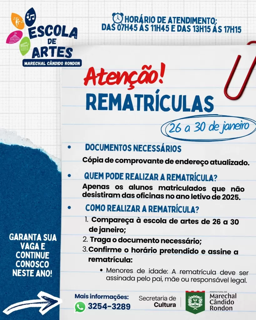 A Secretaria de Cultura de Marechal Cândido Rondon divulgou o cronograma de rematrículas e novas matrículas para as atividades da Escola de Artes. O período de rematrículas ocorre entre os dias 26 e 30 de janeiro, sendo destinado exclusivamente aos alunos que já participam do programa e que não desistiram das aulas em 2025.