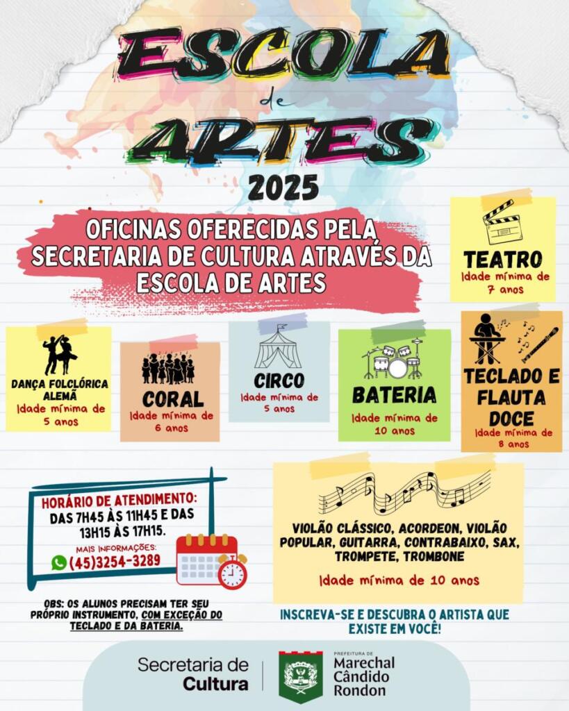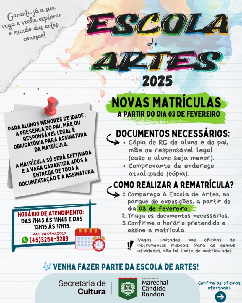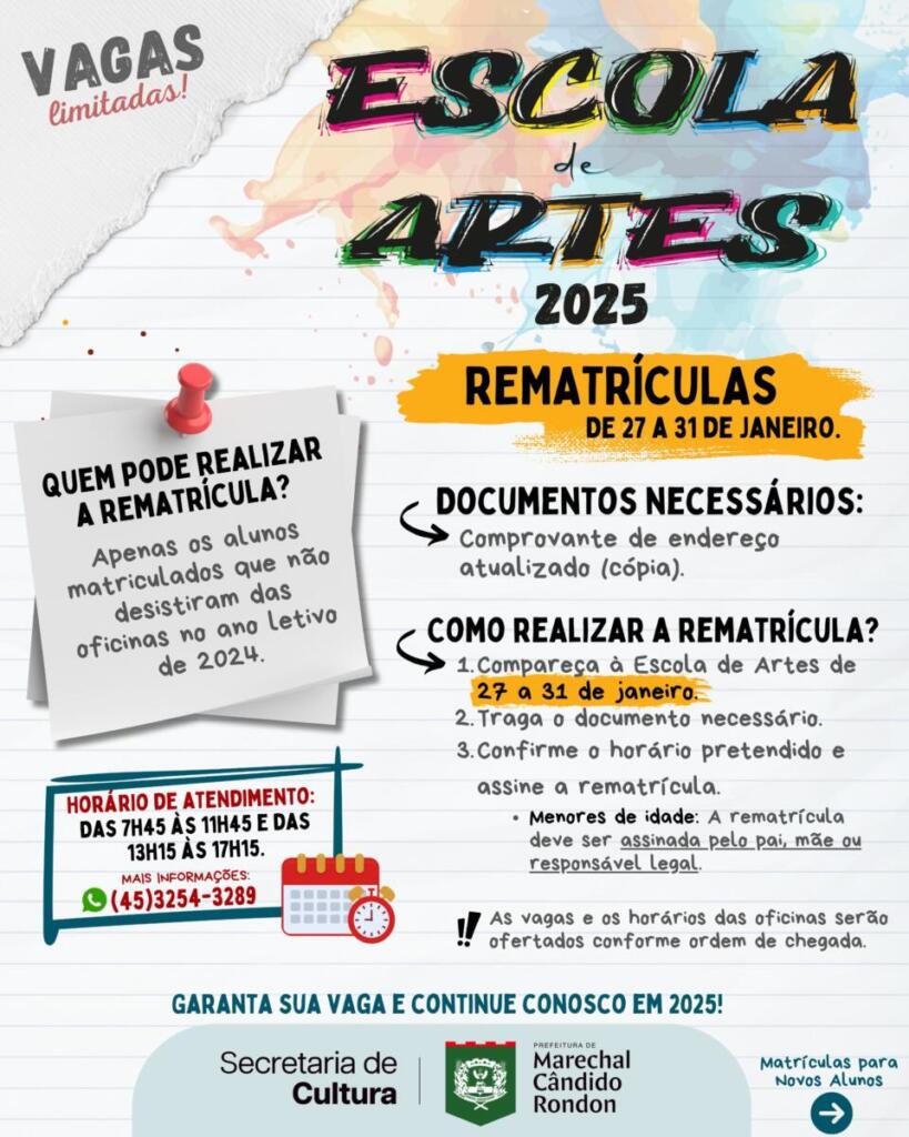 A Secretaria de Cultura de Marechal Cândido Rondon definiu o período de rematrículas e matrículas para as oficinas que serão realizadas pela Escola de Artes em 2025. Os alunos que já fazem parte do programa e não desistiram das aulas em 2024, podem garantir sua vaga entre os dias 27 e 31 de janeiro. Para efetuar a rematrícula, os interessados devem comparecer na secretaria da Escola de Artes, localizada no parque de exposições, no horário das 7h45 às 11h45 e das 13h15 às 17h15, de segunda a sexta-feira. É necessário apresentar uma cópia do comprovante de residência recente e no caso de menores de idade, os pais ou responsáveis precisam estar presentes.
