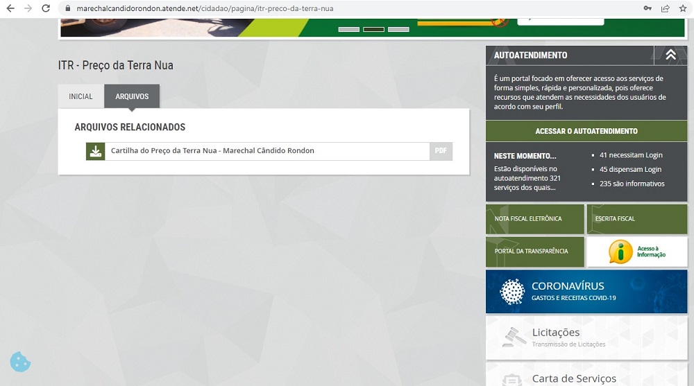 Na área inferior do portal (Clique aqui) consta o banner ITR, um documento com o histórico do valor da terra nua para cada tipo de área da propriedade, que serve de base para fins de declaração do imposto. A recomendação da Secretaria Municipal de Fazenda é de que os produtores observem os valores levantados pelo município com a finalidade de evitar que a declaração venha a cair na malha fina da Receita Federal.