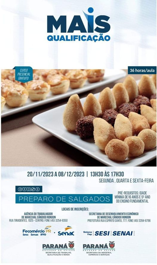 O programa Mais Qualificação, desenvolvido pelo governo do Estado, por meio da Secretaria do Trabalho, Qualificação e Renda, está oferecendo em Marechal Cândido Rondon o curso “Preparo de Salgados”. No município, as atividades são coordenadas pela Agência do Trabalhador (Sine), em parceria com a prefeitura, através da Secretaria de Desenvolvimento Econômico, e o Senac.