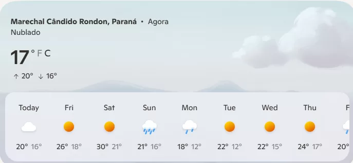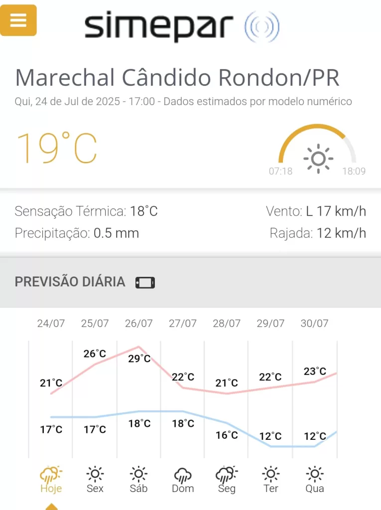 Já no domingo, último dia da Expo Rondon, o alerta volta a subir: a previsão aponta para chuva intensa, com 78% de chance de precipitação e acumulado de mais de 24 milímetros. As temperaturas devem cair, variando entre 16°C e 21°C, e a umidade relativa do ar pode atingir 100%.