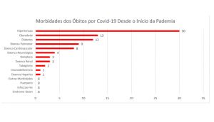 Hipertensão, obesidade e diabetes são as principais morbidades das pessoas que contraíram Covid-19 e que foram a óbito. Dos pacientes que faleceram, 30 eram hipertensos, 13 obesos e 12 diabéticos. Nove pessoas apresentavam problemas pulmonares e oito tinham morbidade vascular. Há pessoas que vieram a óbito e que tinham mais de uma morbidade.