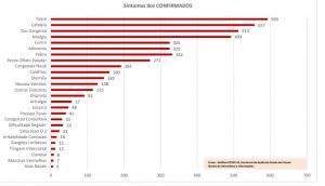 Em relação aos principais sintomas das pessoas que testaram positivo à Covid-19, 593 apresentaram tosse, 557 cefaleia (dor de cabeça), 513 dor de garganta e 493 mialgia; empatados com 325 citações aparecem coriza e adinamia (fraqueza).