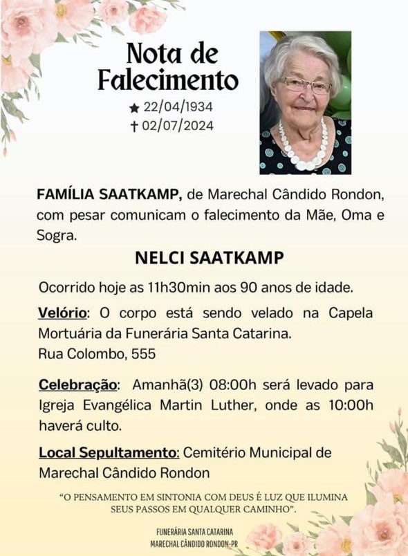 Faleceu ao meio-dia de terça-feira (2), a pioneira rondonense Nelci (nascida Stapenhorst) Saatkamp, aos 90 anos, em decorrência de septecemia e falência renal.