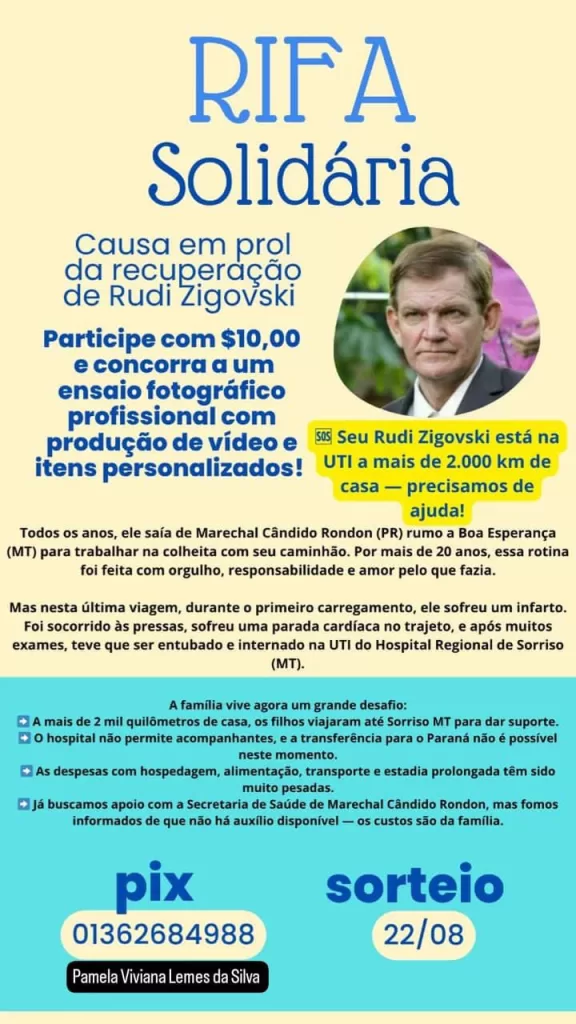 Há mais de 20 anos, ele viajava anualmente com seu caminhão de Marechal Rondon até Boa Esperança (MT), sempre com dedicação e amor pelo que fazia. Nesta última viagem, no entanto, tudo mudou: durante o primeiro carregamento, Rudi sofreu uma parada cardíaca e teve que ser socorrido às pressas. Desde então, está internado, e sua transferência para o Paraná não é possível neste momento.
