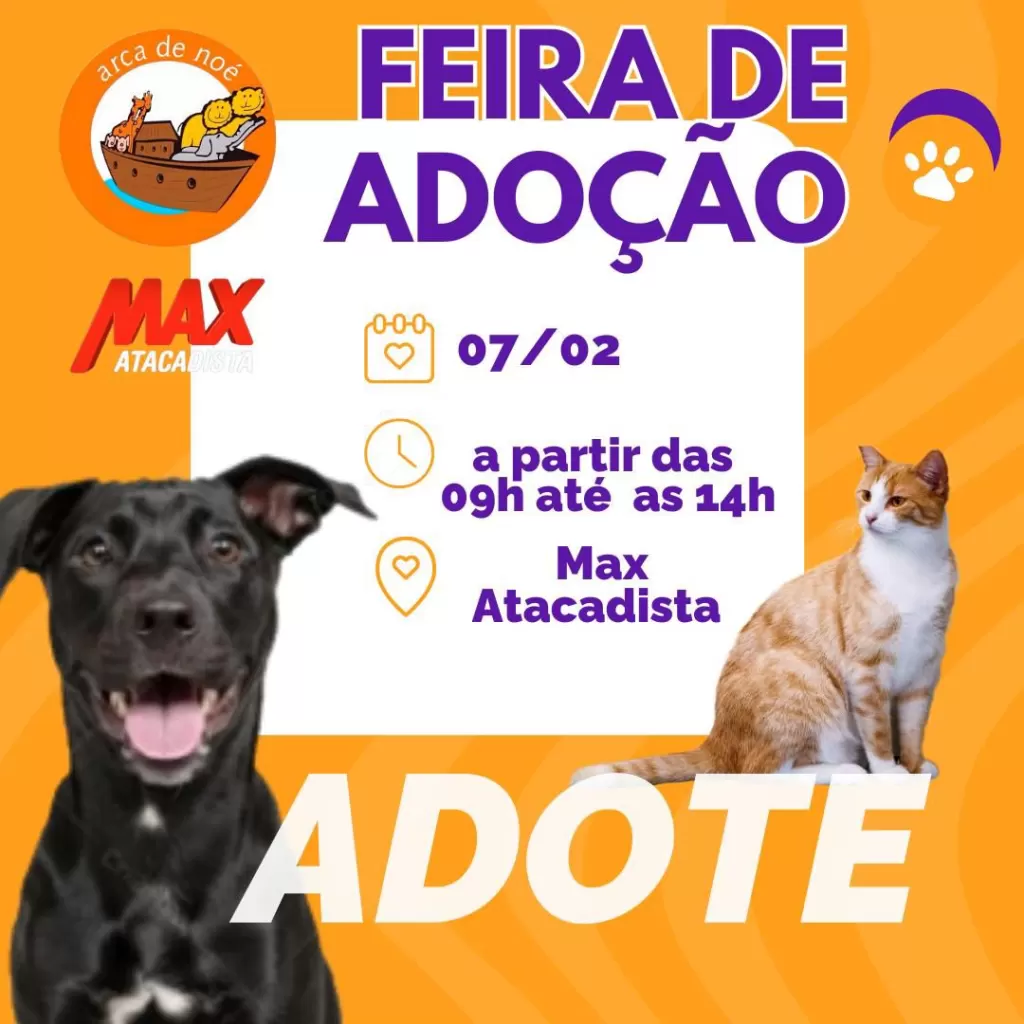 A ONG Arca de Noé promove, neste sábado, 7 de fevereiro, uma Feira de Adoção de Animais no Max Atacadista, em Marechal Cândido Rondon. O evento acontece das 9 às 14 horas e tem como objetivo incentivar a adoção responsável de cães e gatos resgatados.