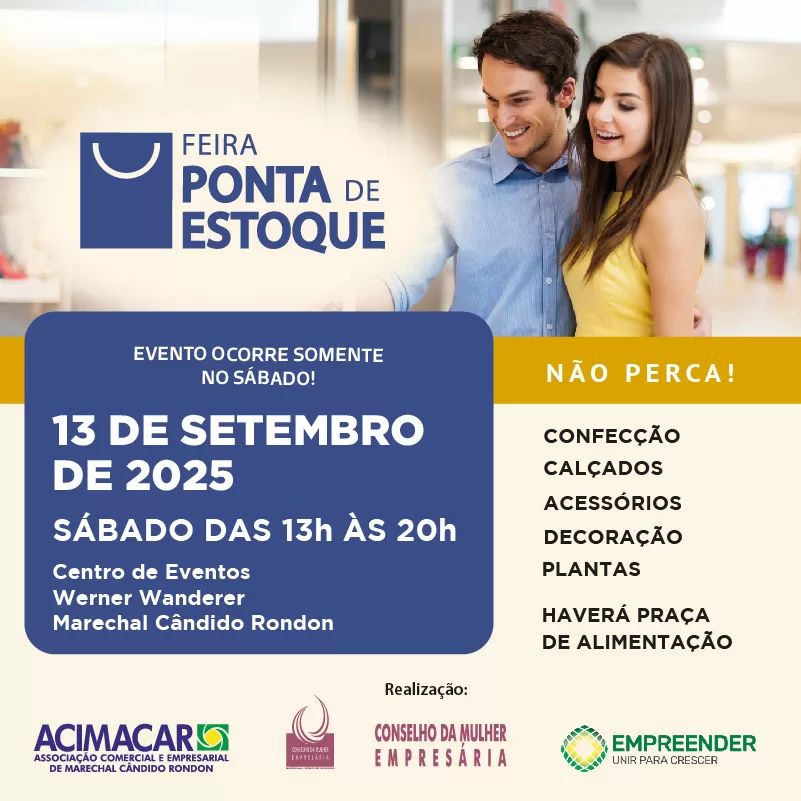 Promovida pelo Conselho da Mulher Empresária (CME) da Associação Comercial e Empresarial de Marechal Rondon (Acimacar), a Feira Ponta de Estoque oportuniza às empresas associadas a chance de liquidarem seus produtos para renovarem os estoques na troca de estação. Para os consumidores, é a oportunidade de adquirir produtos de qualidade com preços competitivos.